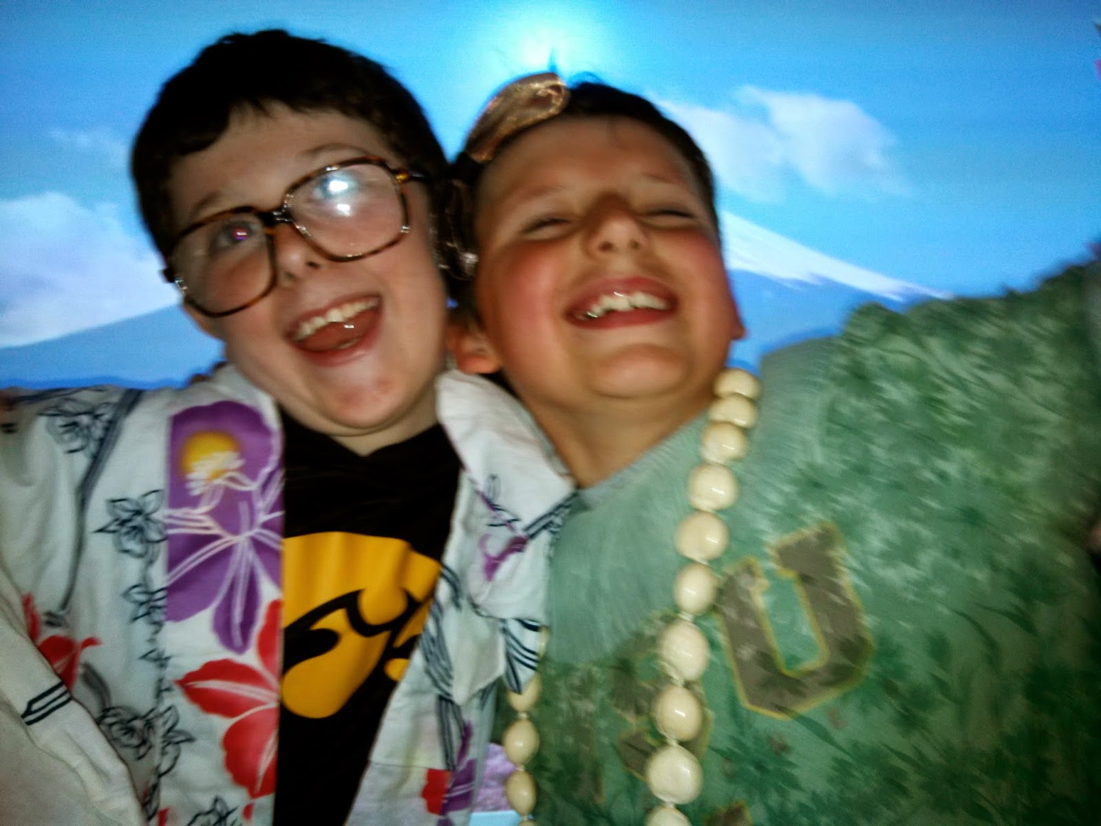 This is a photo of Parker yelling at Braydon for taking the photo too early, while "Chill Chandlarita" is trying to calm him down. FYI Parker--the Iowa Hawkeyes and purple and pink kimono don't really go well together (that was SO last year).